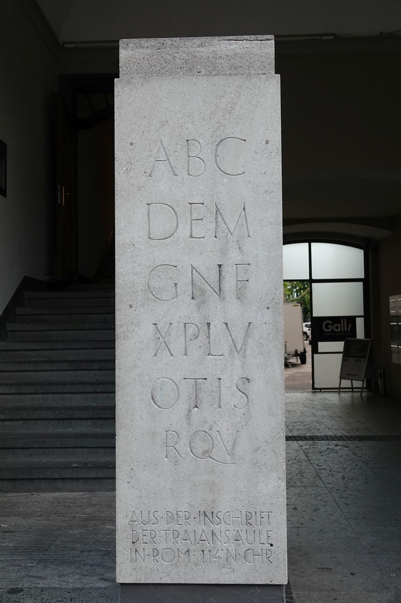 Vor dem Kino Orfeos Erben in der Hamburger Allee steht eine Stele mit dem trajanischen Alphabet