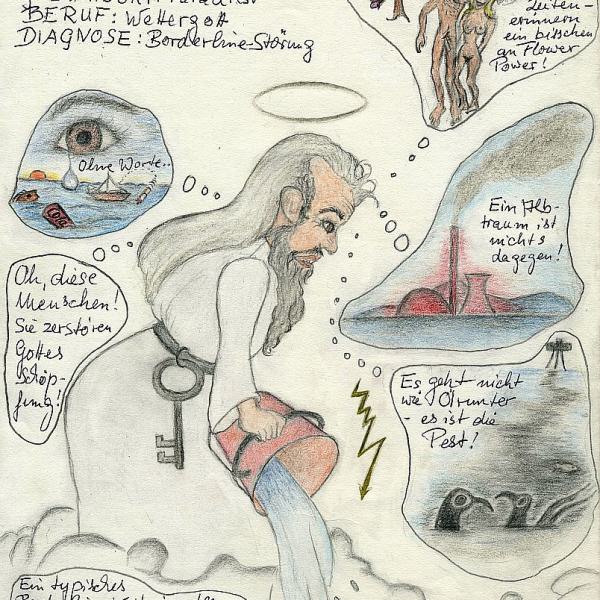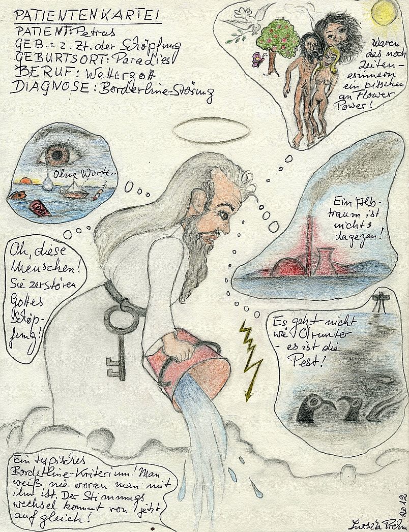 In dieser Zeit vor 10 Jahren wurde mir bewusst, dass ich mit meinen surreal anmutenden Bildern schon längst out bin und entdeckte meine Freude daran, bitter böse Cartoons zu zeichnen, aber die stehen (bis vielleicht auf ein paar wenige Blätter) auf einem anderen Blatt als die Themen der jetzigen Ausstellung.