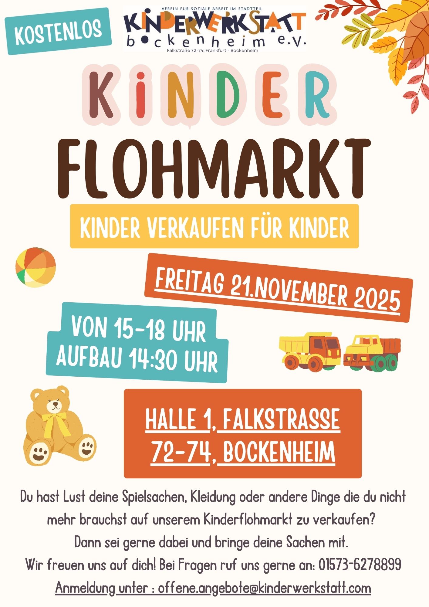 Flohmarkt - Kinder verkaufen für Kinder: Ab 15 Uhr (Aufbau ab 14:30 Uhr) findet in der Halle 1 in der Falkstraße 72 ein Kinderflohmarkt statt. Kinder verkaufen ihre Spielsachen, Kleidung oder andere Dinge. Gerne auch Anmeldungen für Verkaufsstände.